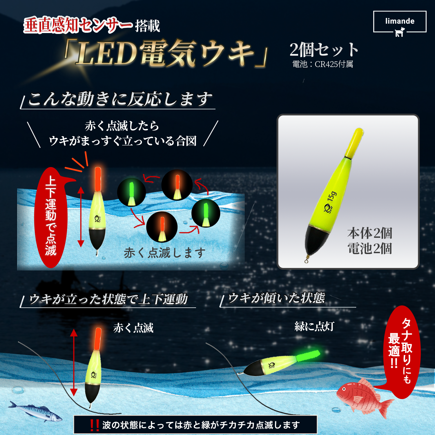 🐟垂直(縦)の動きで色が変化、グリーンからレッドへ点滅し、少し離れていても自分のウキの位置を簡単に確認できます。タナ取りにも便利です!