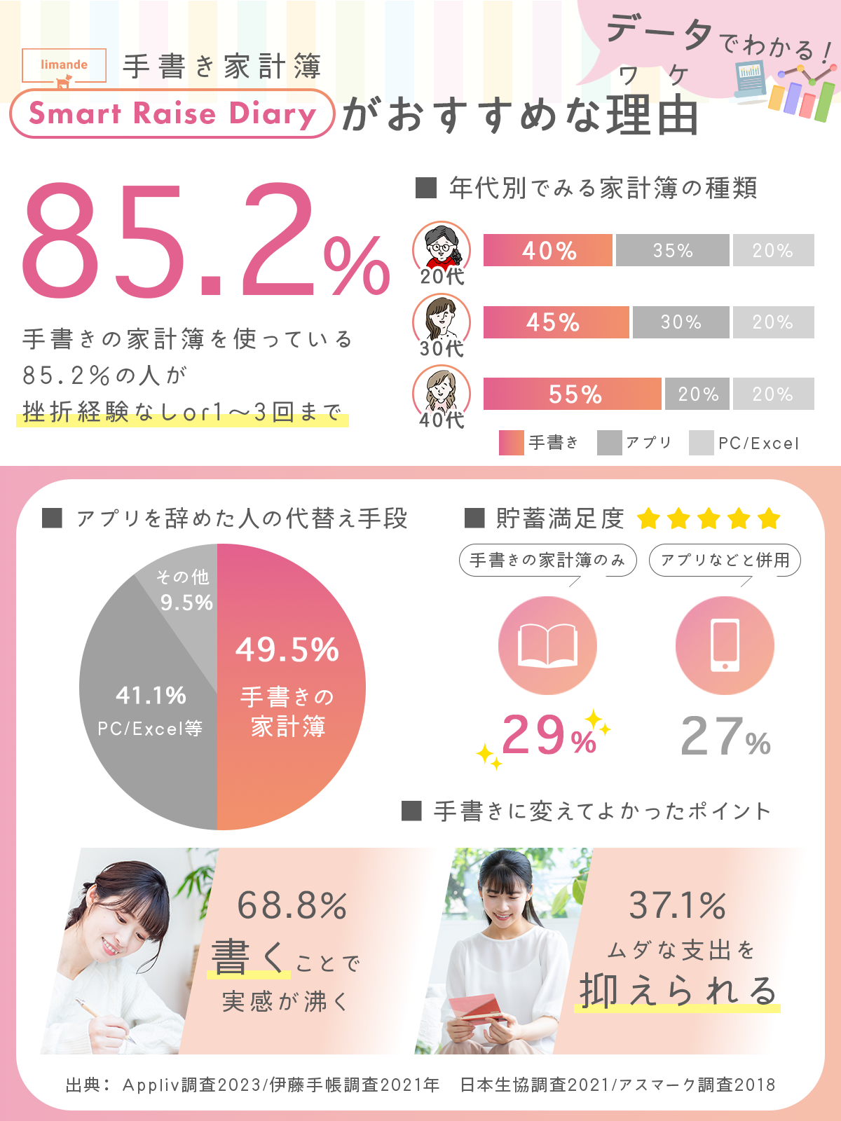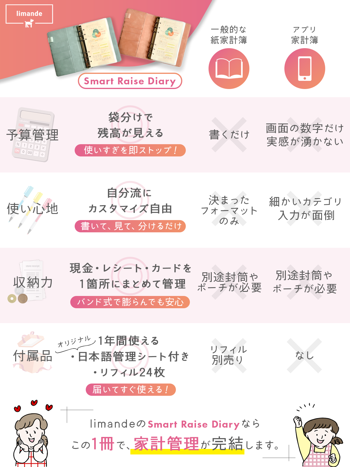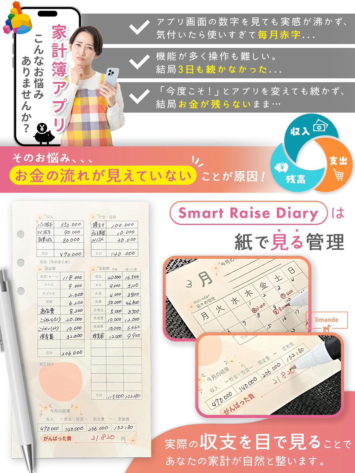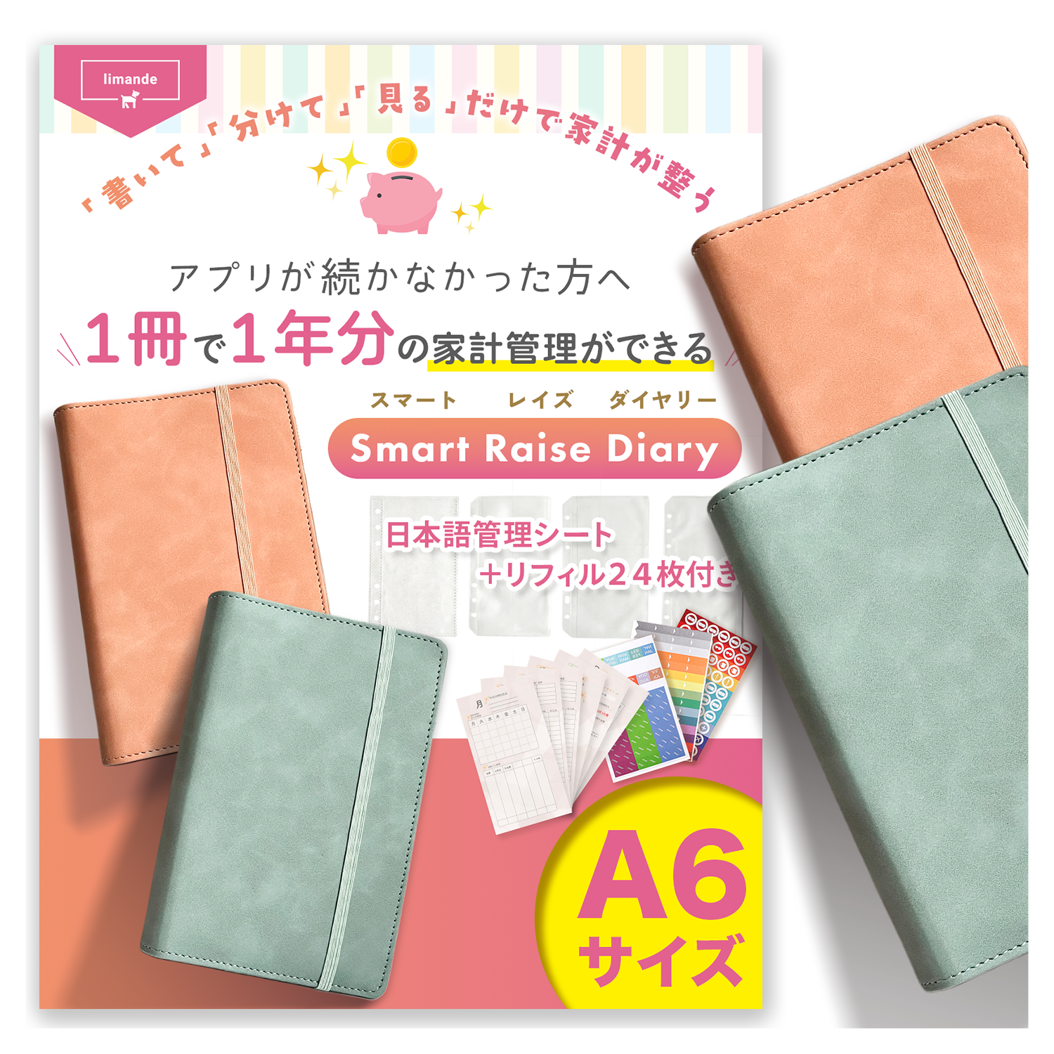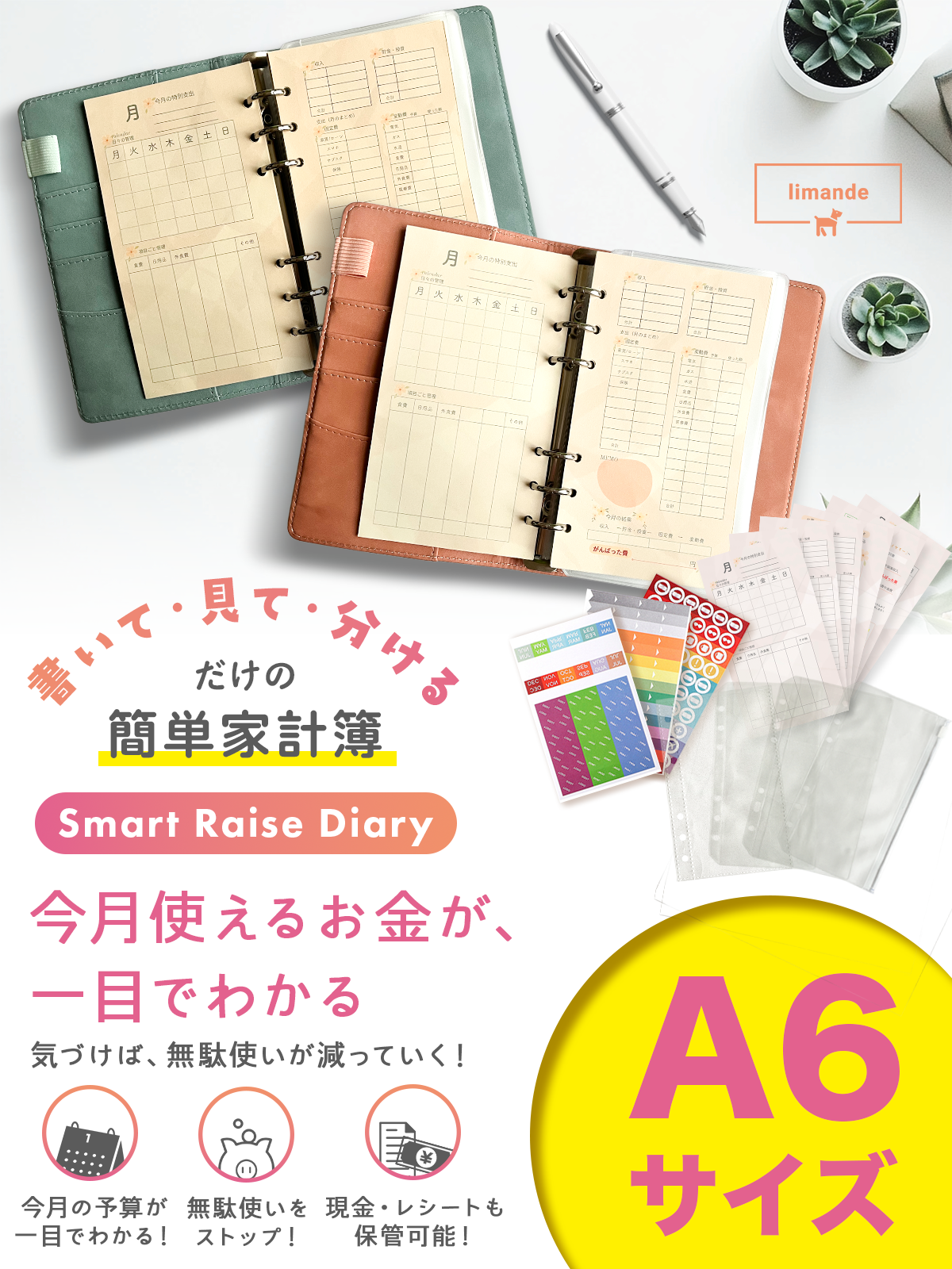 【📒書いて・分けて・見る📒】だけで家計が整う 「家計管理手帳」Smart Raise Diary(スマート レイズ ダイヤリー)は、あえて「紙」にこだわることで、今月の使えるお金をパッと目で見える化します。難しい操作は一切不要。「書く(意識する)」「分ける(管理する)」「見る(安心する)」というシンプルな仕組みが自然と「貯まる体質」へ。アプリの波に揺られ挫折したあなたに。