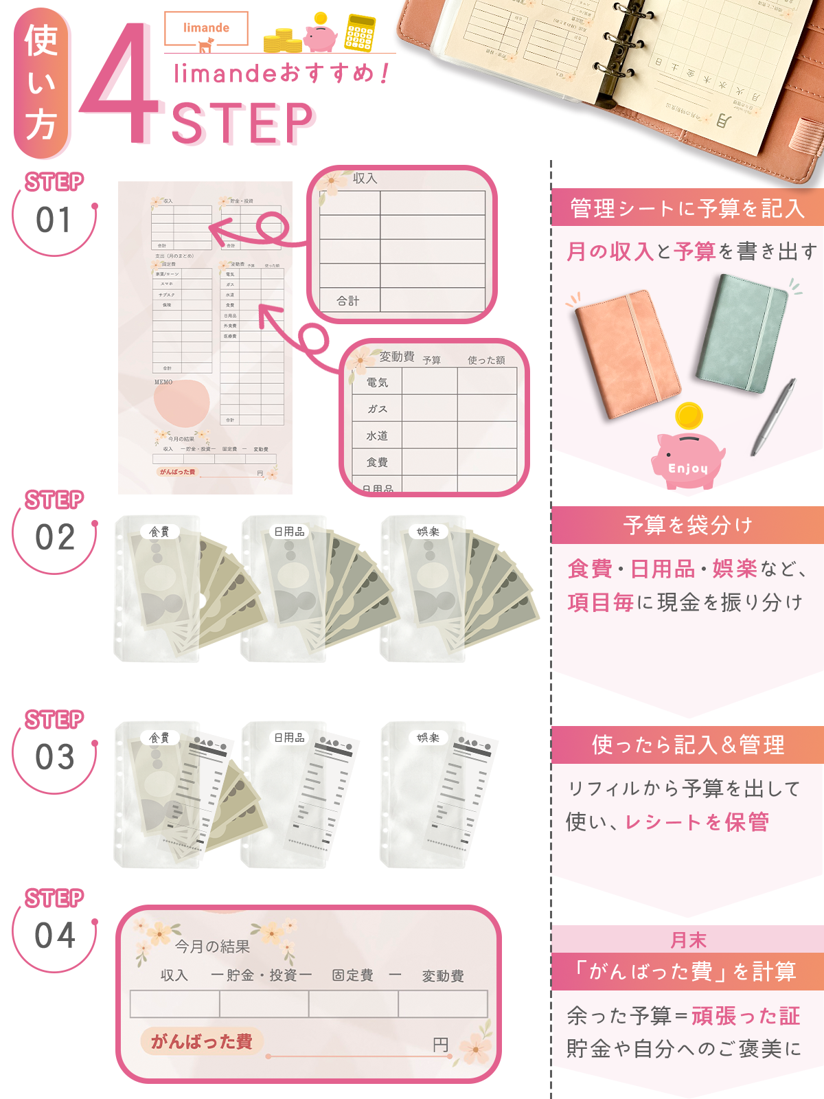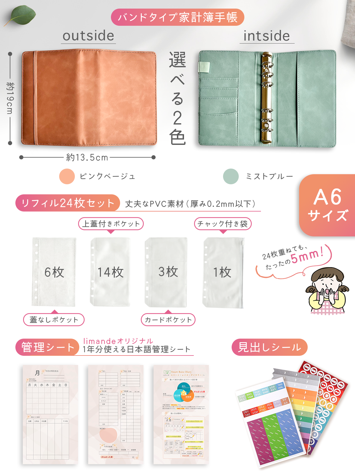 【書いて・分けて・見るだけで家計が整う】 家計簿 袋分け A6 バインダー 24枚リフィル 日本語管理シート付 バンドタイプ家計簿 limande